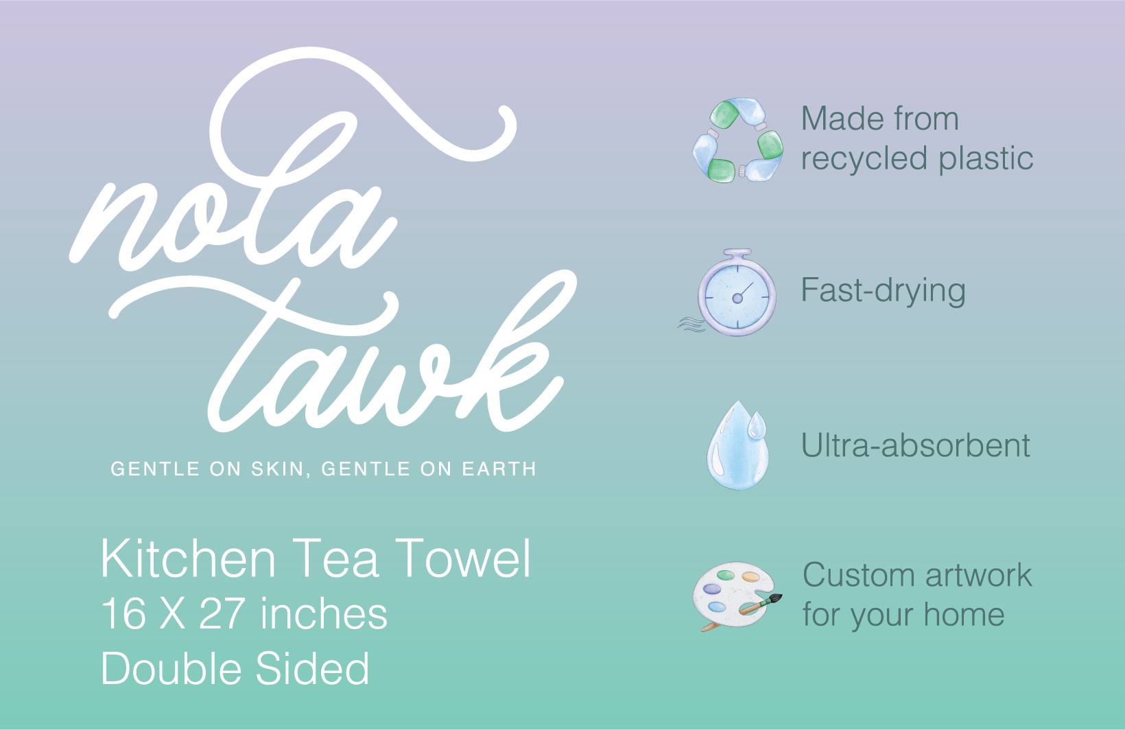 Bring the energy and artistry into your kitchen with Nola Tawk’s newly revamped kitchen towel. Designed for both style and performance, this eco-friendly kitchen towel is made from recycled plastics and features exclusive artwork by local New Orleans artists.