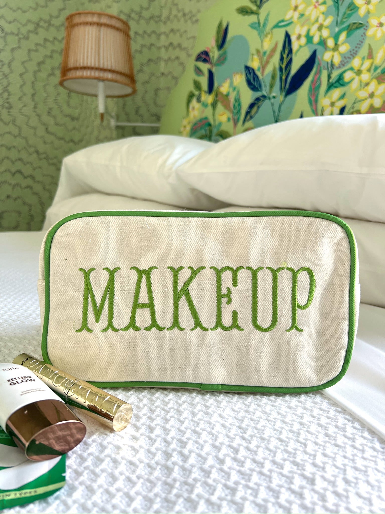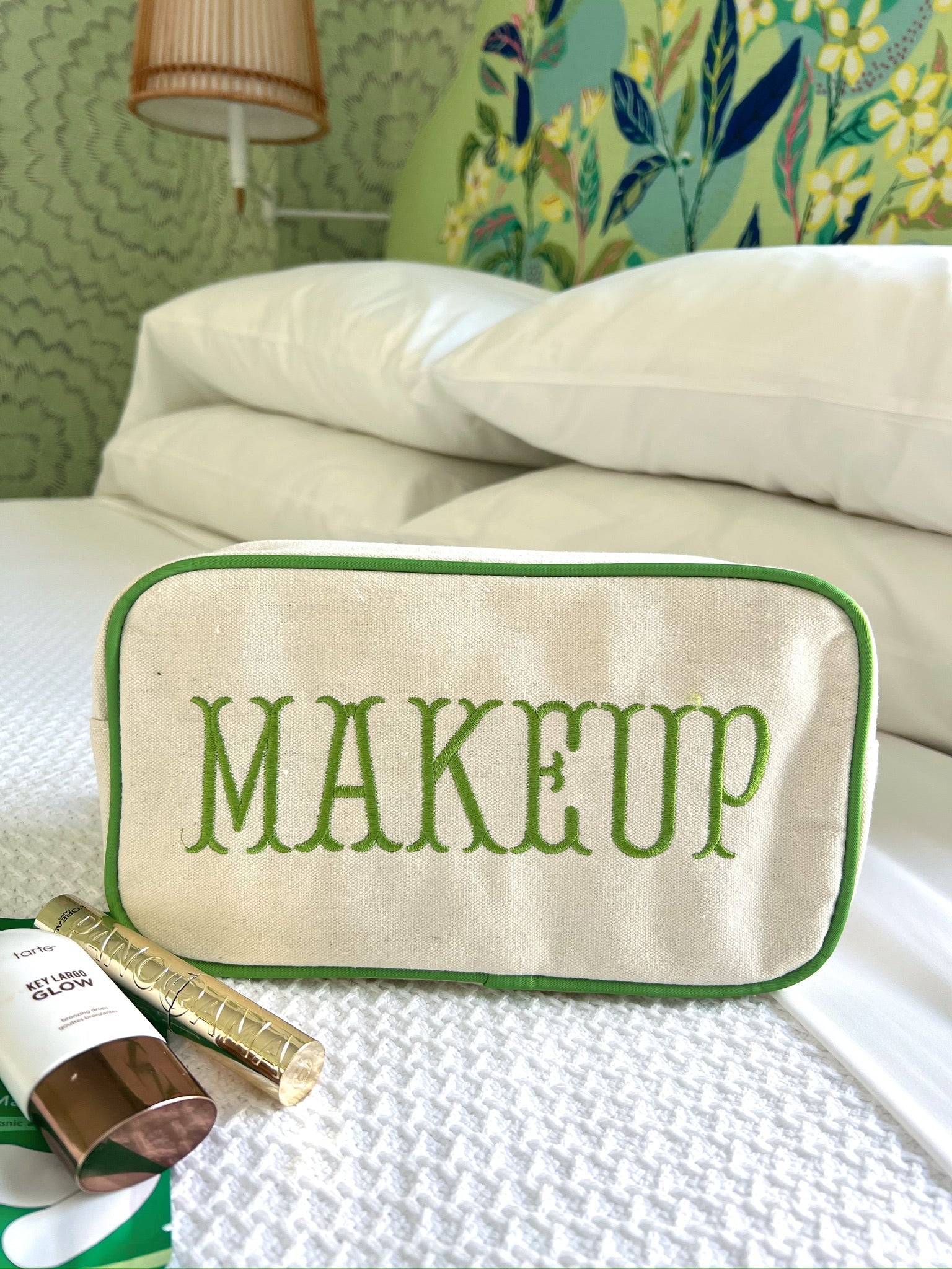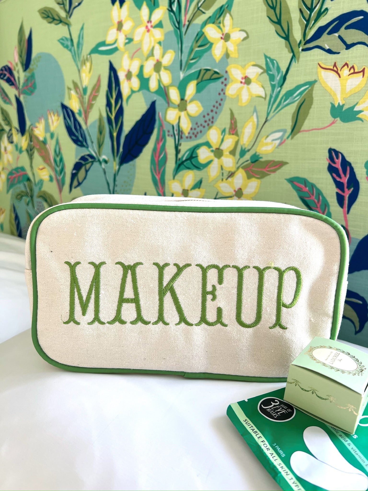 - Our first green canvas makeup bag with this super fun font for embroidery!