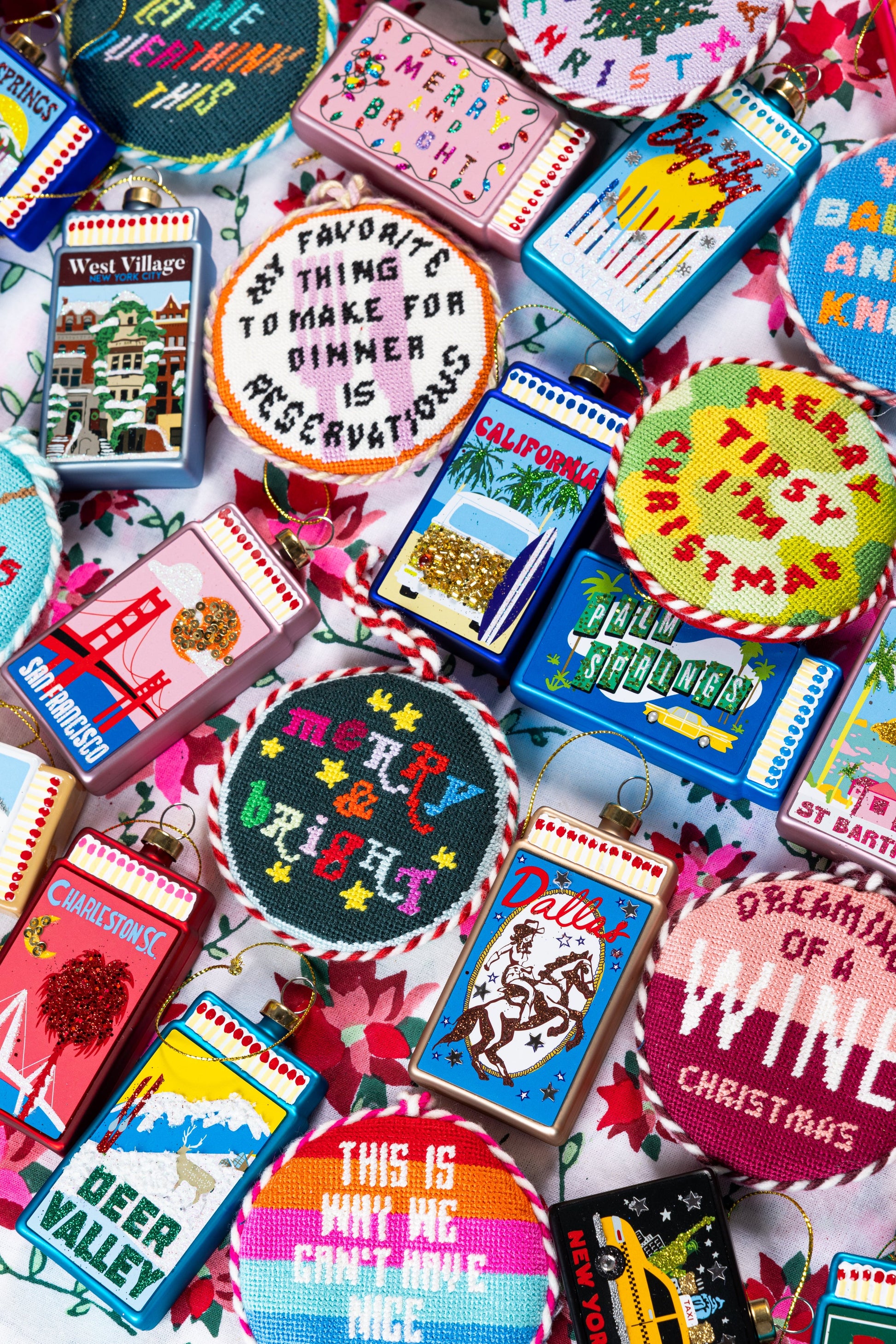 Take your holiday decor from trad to rad with Furbish's curated assortment of festive AF needlepoint pillows, ornaments, tree toppers, stockings, and tree skirts.