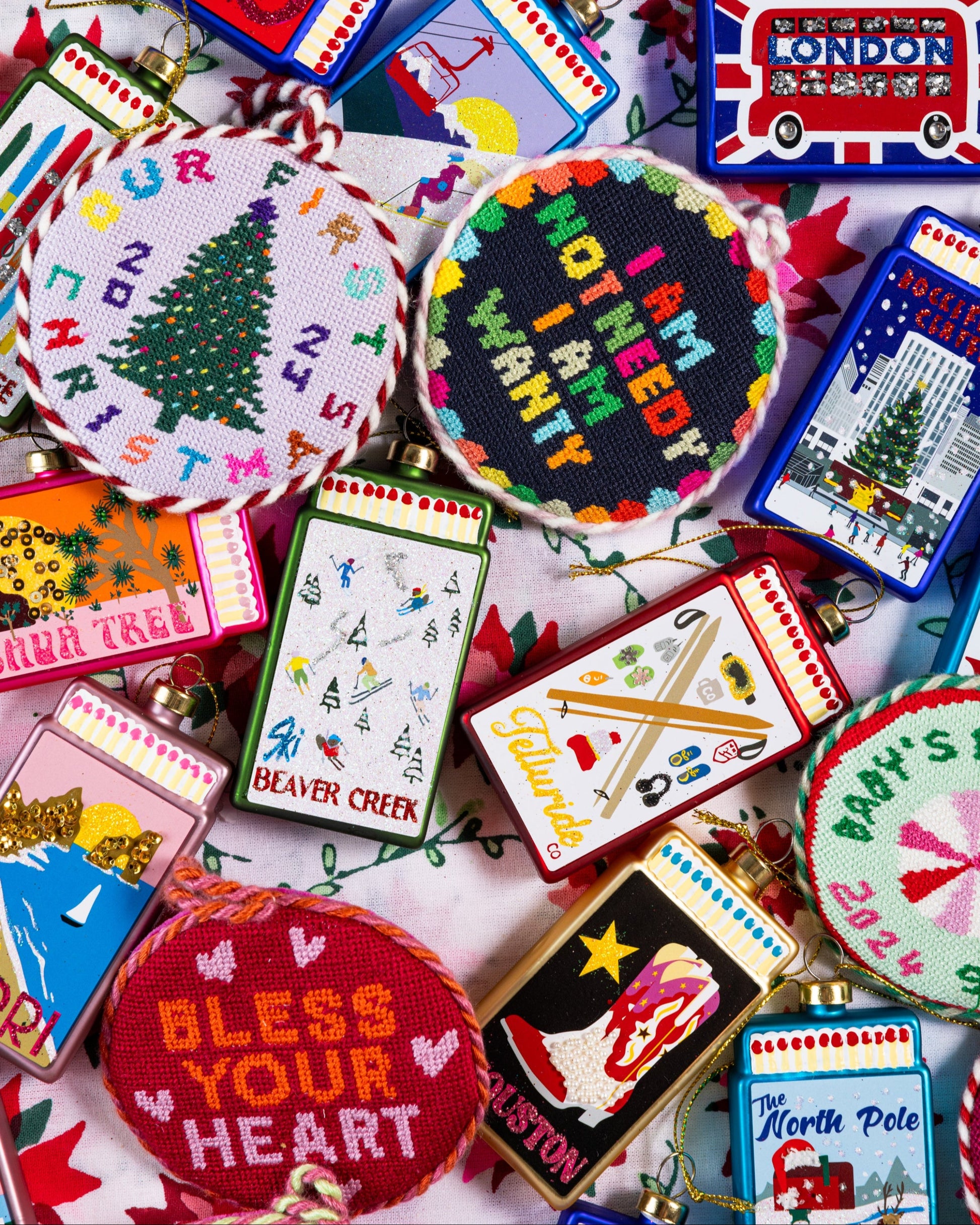 Take your holiday decor from trad to rad with Furbish's curated assortment of festive AF needlepoint pillows, ornaments, tree toppers, stockings, and tree skirts.