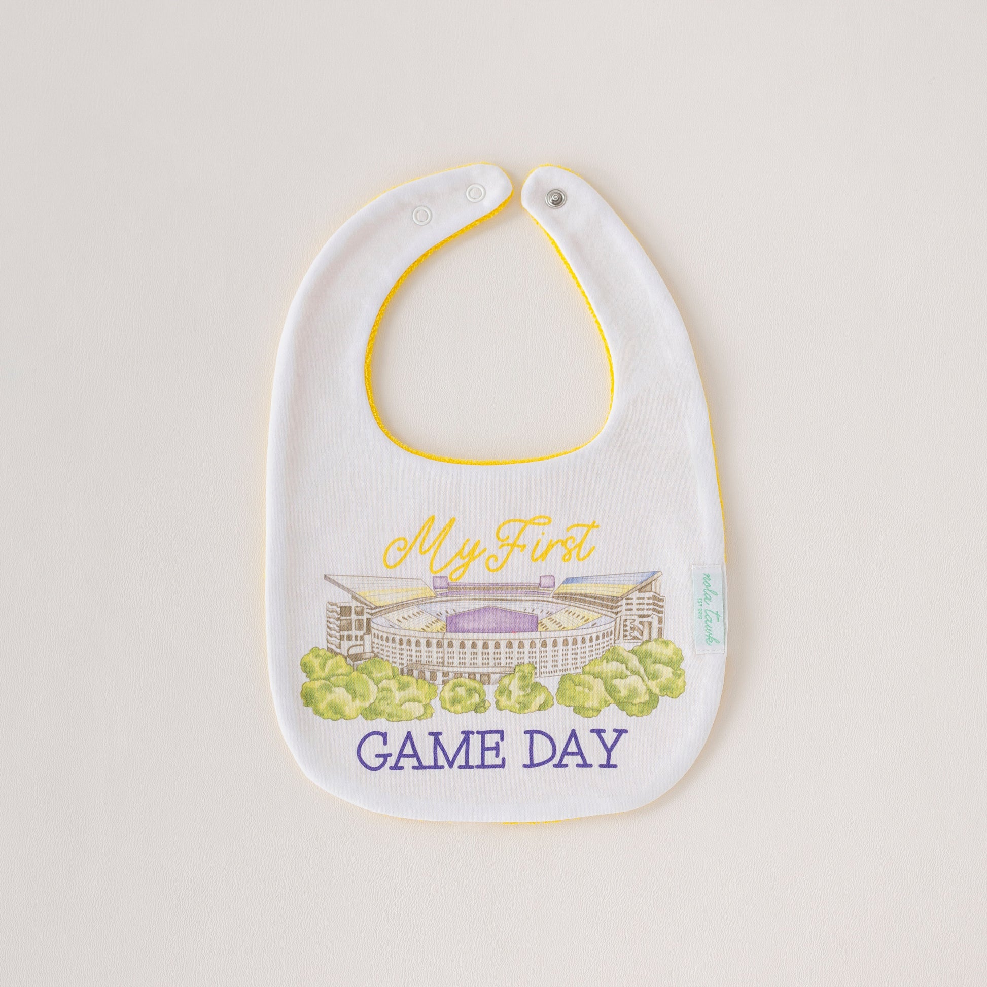 Celebrate your baby’s very first LSU game day in true Louisiana style with our “My First Game Day” organic cotton baby bib! Featuring a vibrant illustration of Tiger Stadium on the front and a soft, absorbent yellow-gold terrycloth back, this bib keeps little fans comfy and mess-free while showing off their purple and gold pride. Perfect for game days, tailgates, and everyday wear, it’s a must-have accessory for every future Tiger.