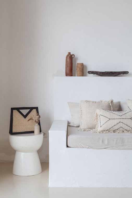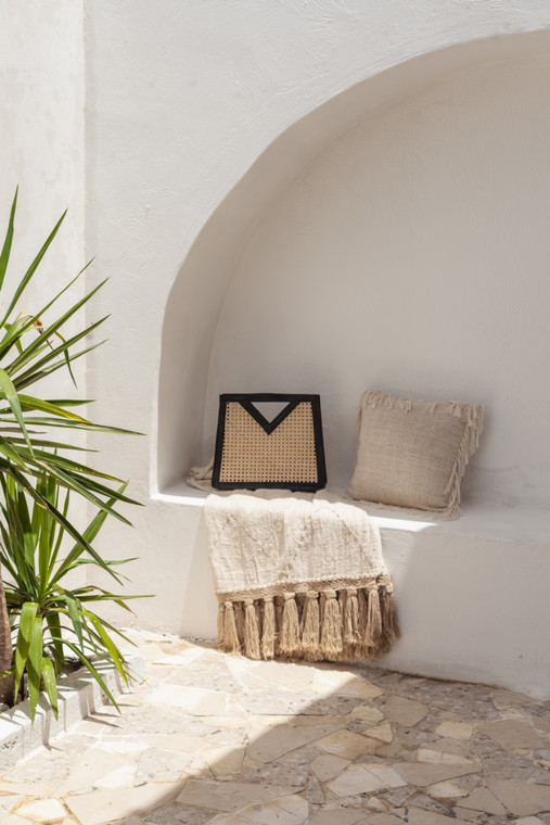 This elevated Bag features genuine leather detailing and cane webbing along with ample storage space. The natural elements of this bag combine beautifully to create a modern and bohemian feel. Each bag is handmade by our Balinese Artisan Partners and tells a story of craft, culture and innovation. Available in three colorways- Black, Cognac and Blush.