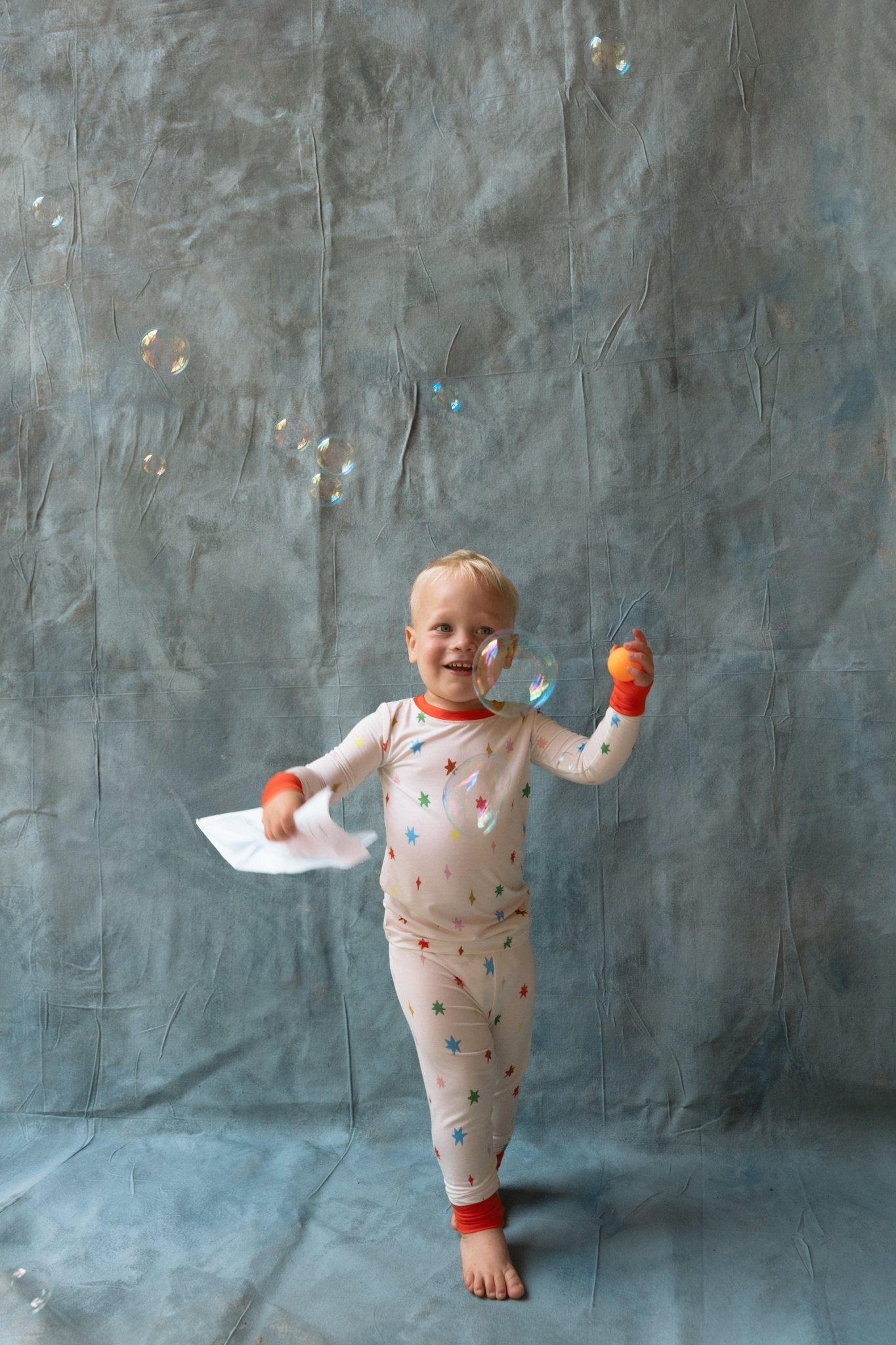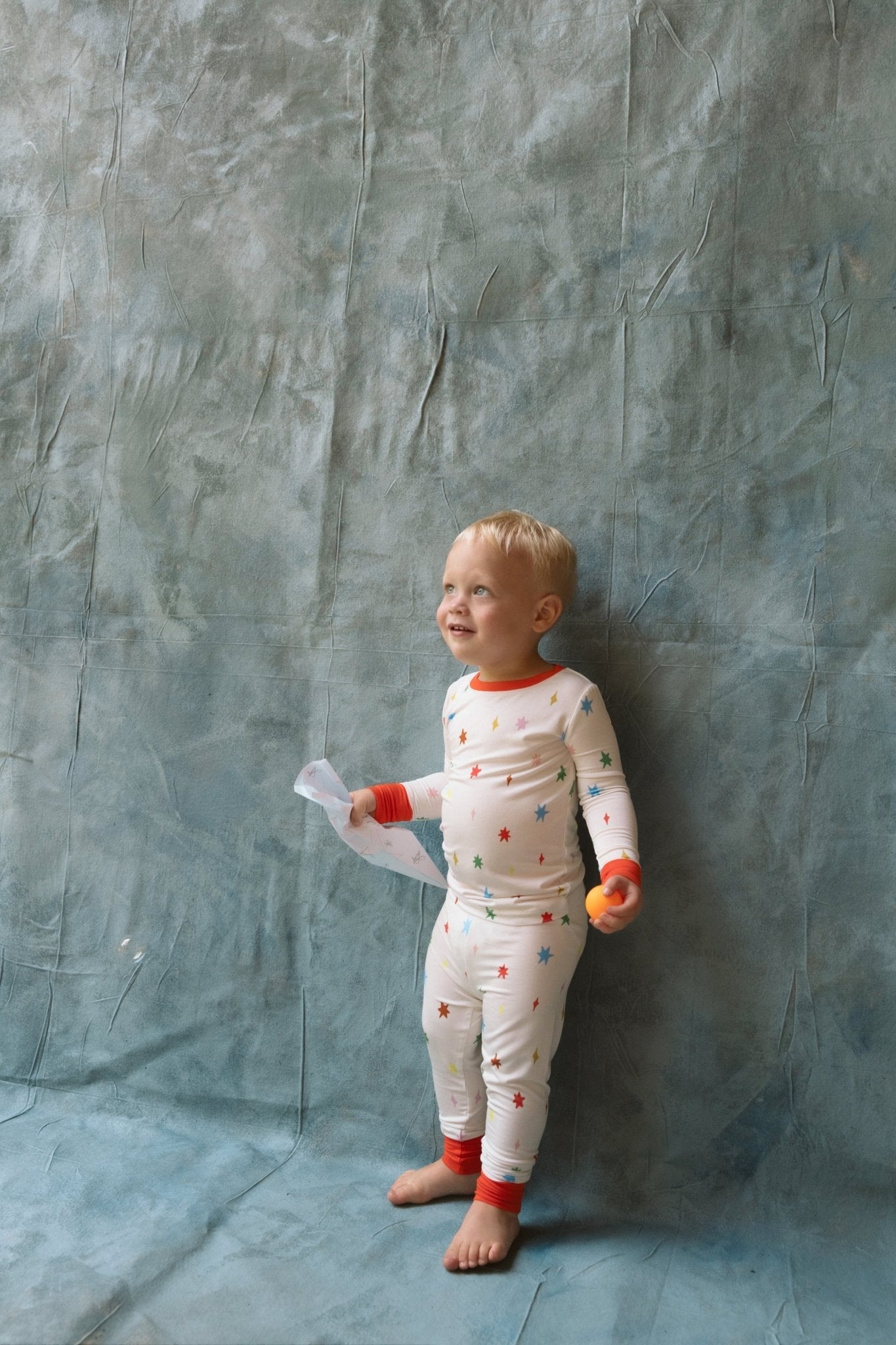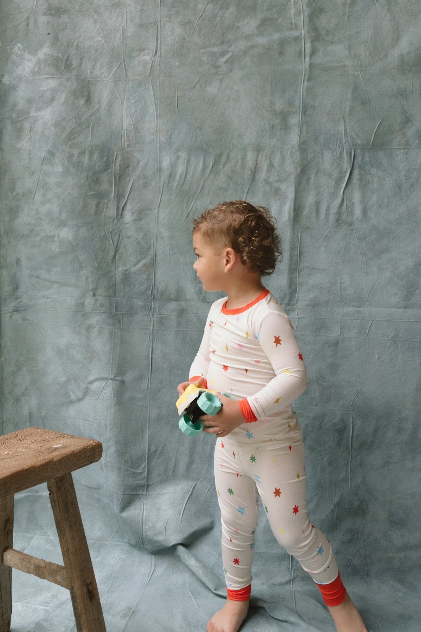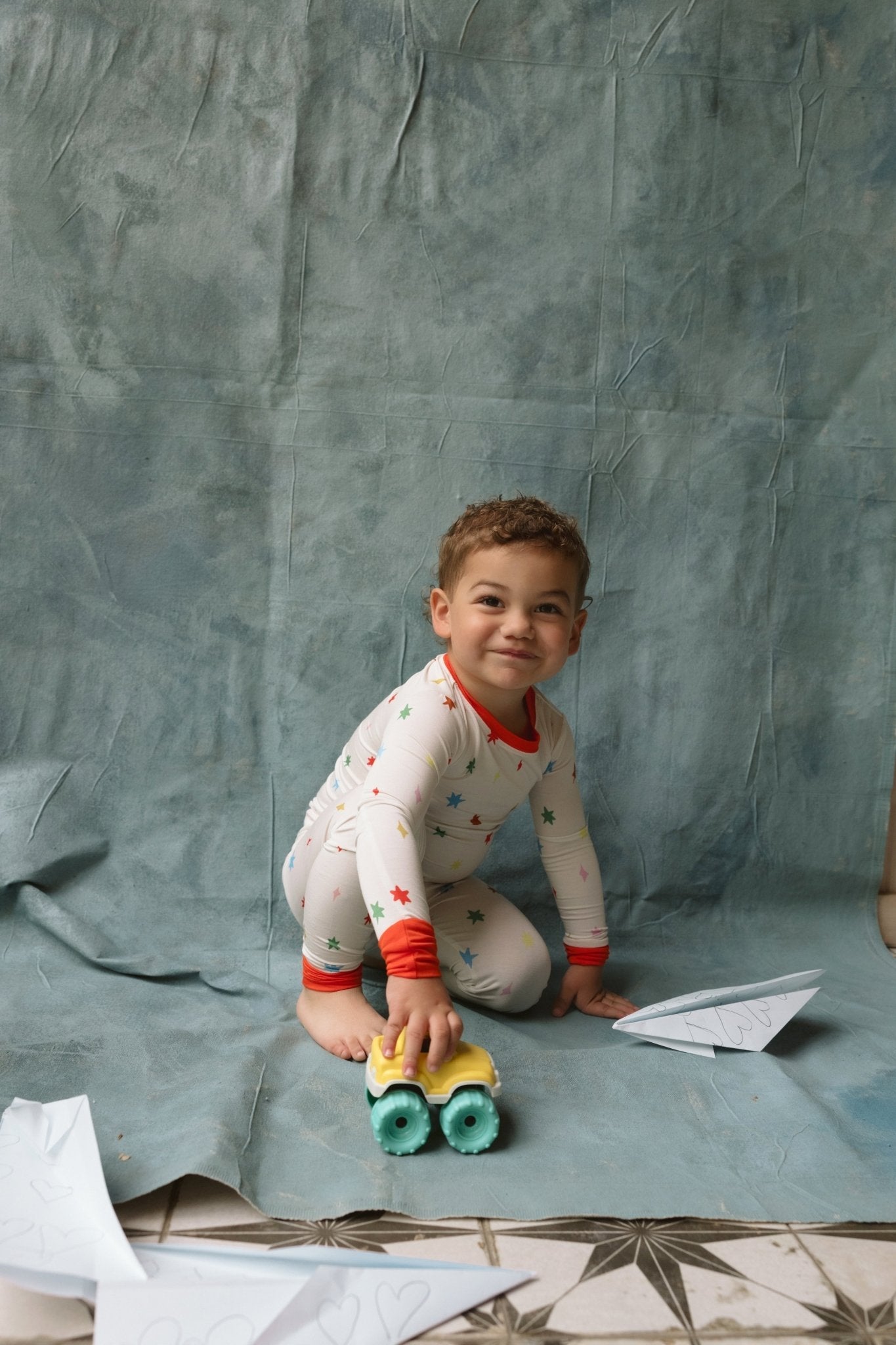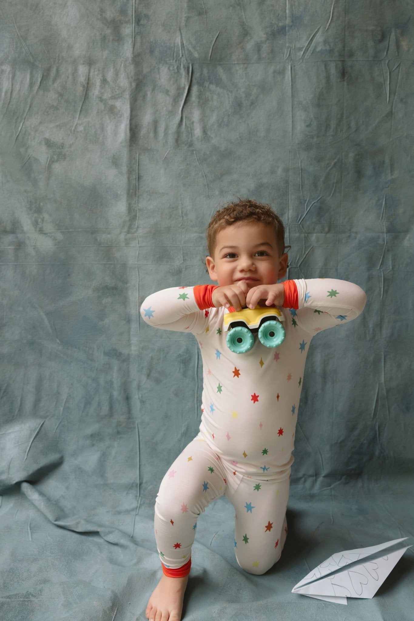 Our Starstruck Two-Piece Toddler & Kids Pajama Set is made for cozy days. This long-sleeve top and matching pants set features a playful star print and is crafted from a premium blend of 95% viscose from bamboo and 5% spandex — soft, breathable, and stretchy for all day comfort.
