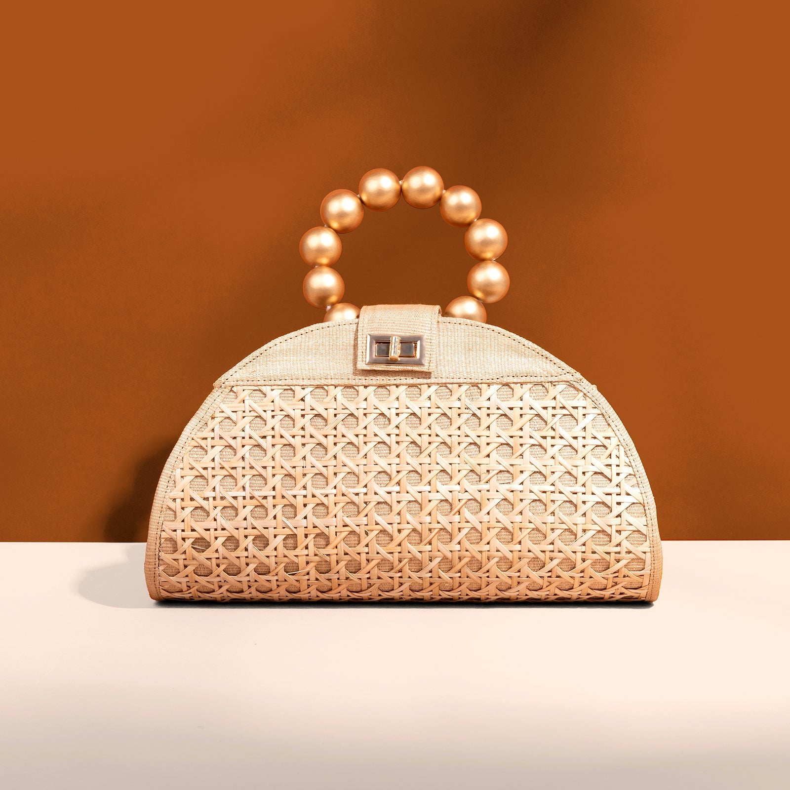 THE ISABELLA Tan Rattan Solihiya Weave and Gold Bead Top Handle Statement Bag