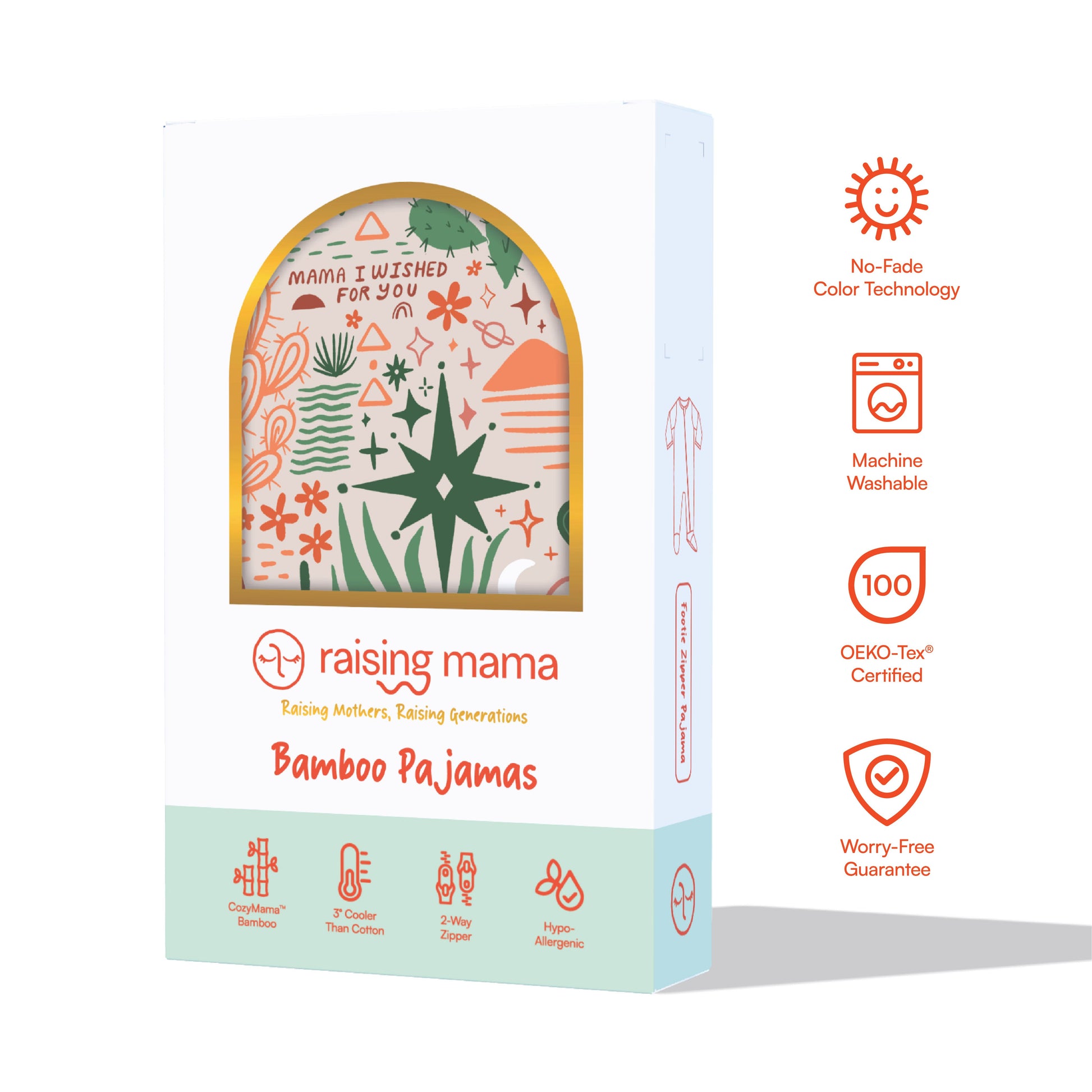 Outfitted with signature Raising Mama® "mama-at-peace" footie grips, this bamboo baby sleeper has elastic backing on the footies for a snug fit, and will hug those baby chubs for extra cozy snuggles.