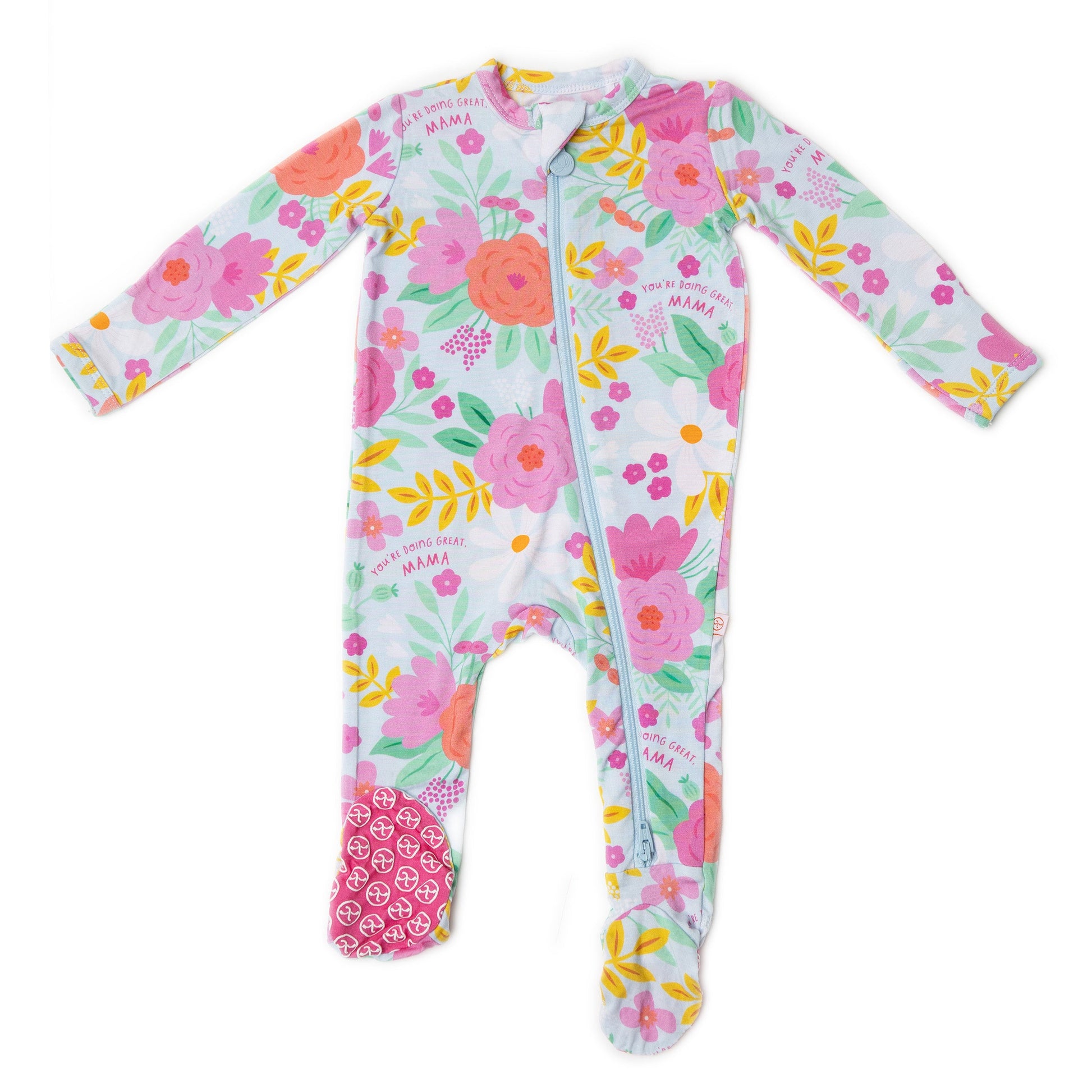 This footie zippered one piece was made with mama (or dada) in mind. Our bespoke, hand-drawn prints are crafted into buttery soft baby pajamas to comfort a tired and struggling mama and spark some joy in her day.